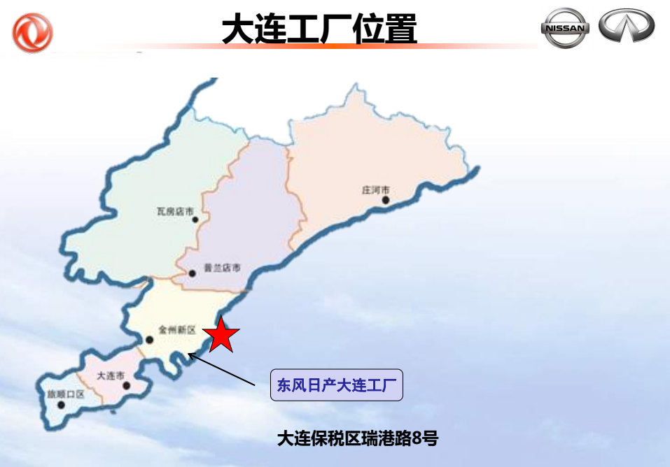 下面重点介绍一下东风日产大连工厂的具体情况:东风日产大连分公司是东风日产的第四大生产基地,位于大窑湾北岸,于2012年6月开始建设,2014年10月正式量产。目前实行双班制,每年产量能达到19.1万辆。大连工厂占地132万平方米,包含冲压、焊装、涂装、树脂和总装五大工艺。其工艺设备水平及自动化全面导入业界先进技术及装备,将比肩日产全球标杆工厂花都第二工厂。