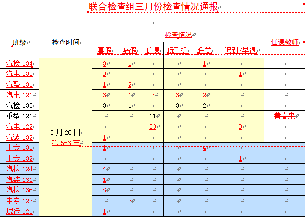 (3)强化学生日常管理。包括上课、自习、周末晚点名等。各班做好考勤登记统计工作,每周定期公布考勤情况。加大检查力度,逐步纠正在学生中存在的散漫、懒惰和迟到、早退、旷课等现象。